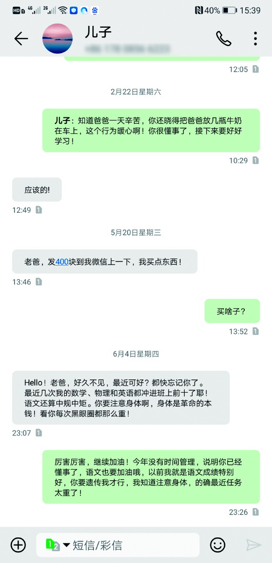 晏飞与大儿子的短信聊天手机截屏。 受访者提供