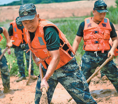王子浩(前)和战友一起在余干县古埠镇齐埠联圩张杨段开挖导渗沟。池小强摄