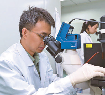 张晓鹏在实验室用显微镜观察细胞生长情况。邵龙飞摄(新华社发)
