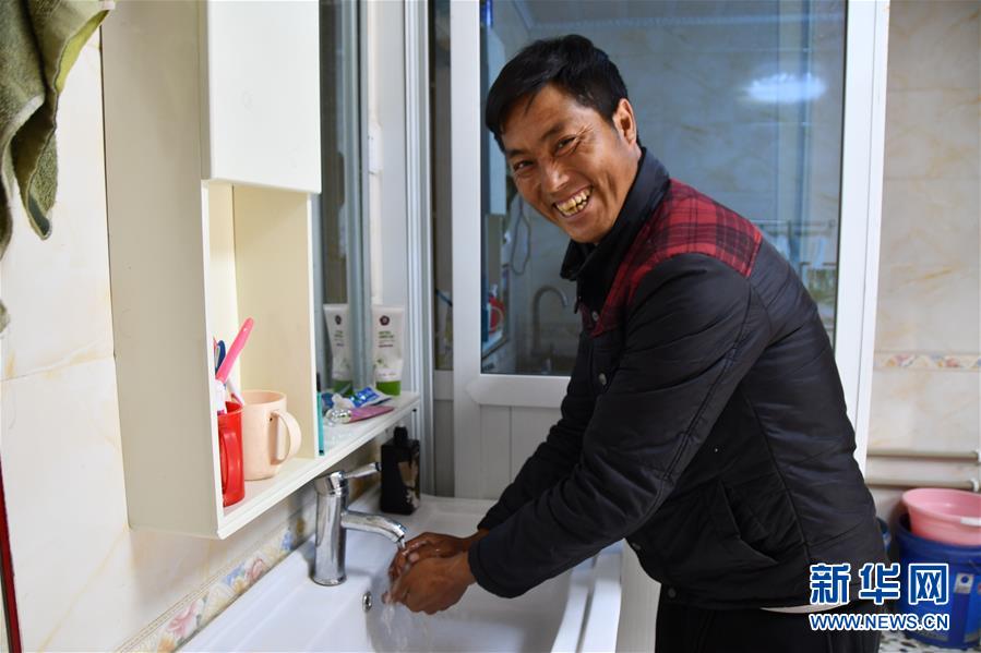 彭措在改建的卫生间内洗手(7月28日摄)。新华社记者 周相吉 摄