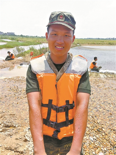 听闻命令,已经在抗洪一线奋战8天7夜的王子浩立即随部队抵达任务点。来不及休息,他马上加入搬运沙袋的行列。