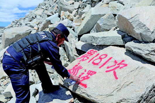 索朗达杰在岗布冰川巡逻时,在石块上标记巡逻次数。记者刘小草摄