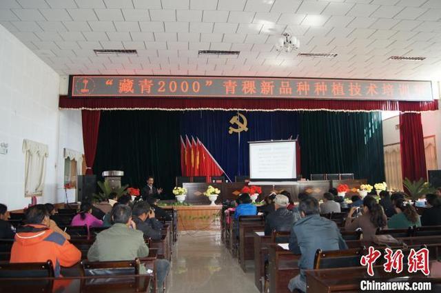 图为2014年,尼玛扎西(讲台发言者)在阿里地区普兰县推广“藏青2000”种植(资料图)。西藏农科院 供图