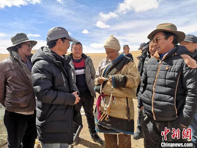 图为尼玛扎西(左二)在阿里调研时和农民聊天(资料图)。西藏农科院 供图