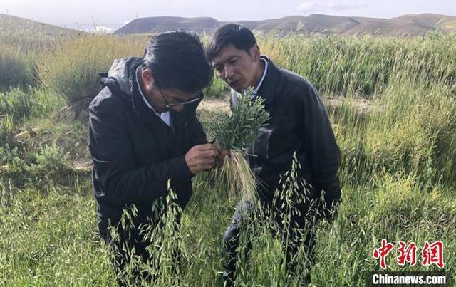 图为尼玛扎西(左)在青稞种植地调研(资料图)。西藏农科院 供图