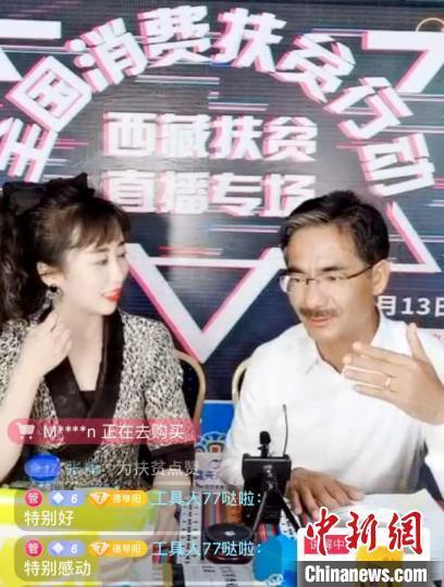 图为尼玛扎西(右)参与西藏扶贫直播(视频截图)。西藏农科院 供图