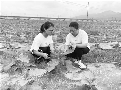 李正丽(右)与同事张丽在榕江大坝进行茄子病虫害田间调查 受访者供图