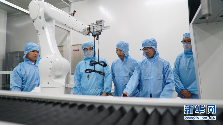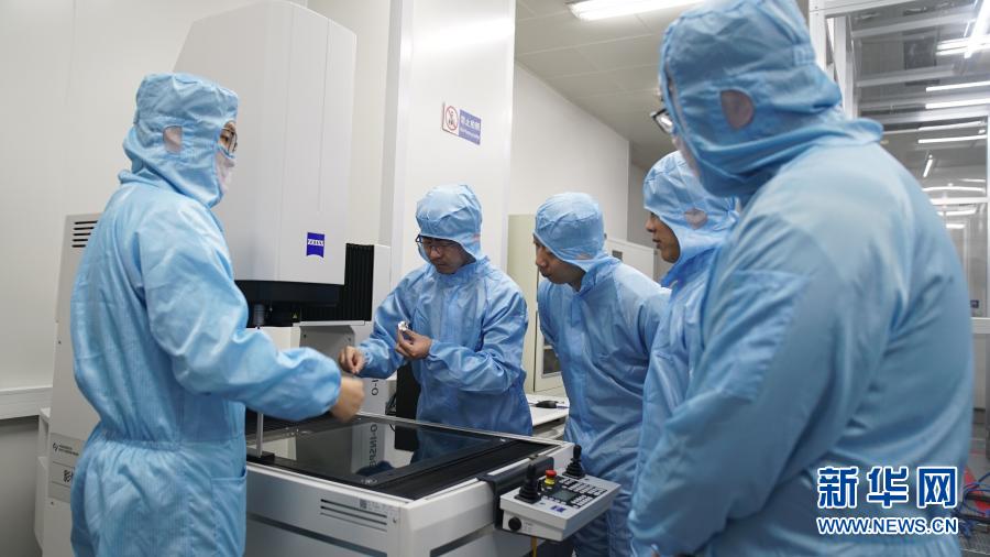 在中科院长春光机所,科研人员隋延林(中)和同事们探讨科研方案(11月25日摄)。新华社发(王帆 摄)