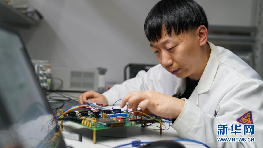在中科院长春光机所,科研人员隋延林调试相位计数字电路板(11月25日摄)。新华社发(王帆 摄)