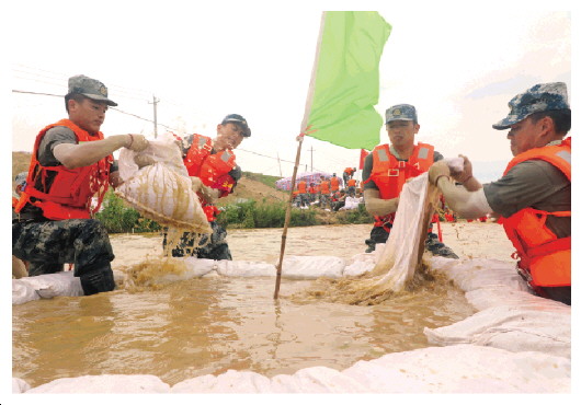 排长王浩撑着腰,一声不吭地等战友把沙袋送到肩上,歪着身子将一个个沙袋运上大堤。