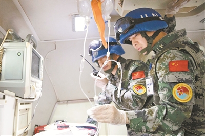 今年3月的一天,涂翔宇坐在闷热颠簸的装甲救护车里,汗水顺着他的头盔带往下滴,打湿了他身上厚重的防弹衣。顾不上擦汗,他一边将伤员体征数据报告给医生,一边按照医生的指令配合其完成救治工作。