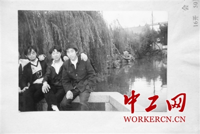 1989年4月,学徒第二年和工友在江阴船厂内的小公园合影。