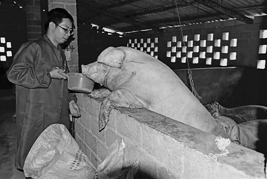 图为黄典勇正在喂养生猪。