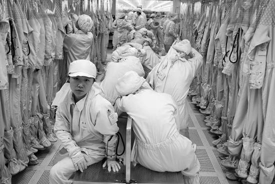 图片拍于占有兵当时打工的电子厂,这里的女工平时要对着显微镜工作上十个小时,眼睛十分疲劳,不少人都趁着工间休息的当会儿闭目养神。可画面中的女主人公,却从周遭疲惫的身影中脱离出来,她直视镜头、眼睛闪亮,“透着一股想从环境中挣脱出来的意味。”