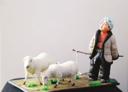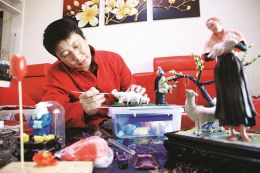 一块柔软的面团,被一双灵巧的手反复揉搓,加入需要的颜色,再一遍一遍揉匀,擀扁,塑形,切条,在预先用铁丝“骨架”造型、并被一层层报纸包裹好的“躯体”上,缠绕覆盖,接缝抹光;安上用同样方法做好的细致入微、神态逼真的头部、四肢、尾巴……不一会儿,一个浑身雪白、顽皮可爱的“小绵羊”就呈现在眼前。