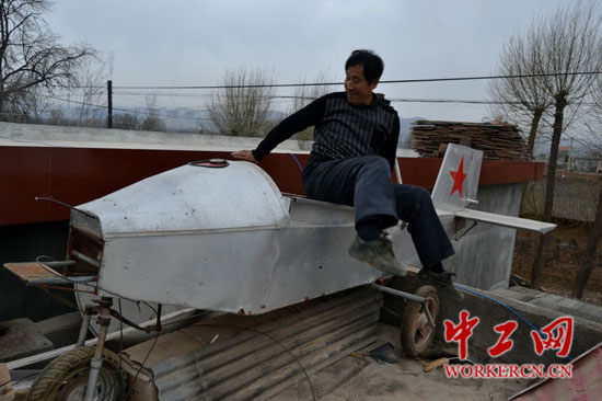 2015年3月22日,甘肃平凉农民陈连学和他自学知识研制的“小飞机”。