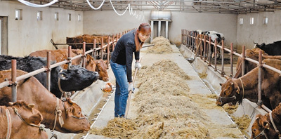 石冠军正在给牛喂饲料。