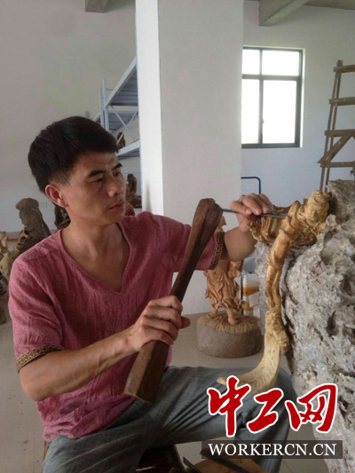 “创作就要创作出与别人不同的作品。在那次全市雕艺职工技能竞赛中,我的作品获得前辈的肯定,让我树立了自主创业的信心。”2013年底,他从公司辞职,与同样从事木雕工作的妻子,在张坂镇玉塘街共同创办了佰艺艺术馆和木雕工艺厂。
