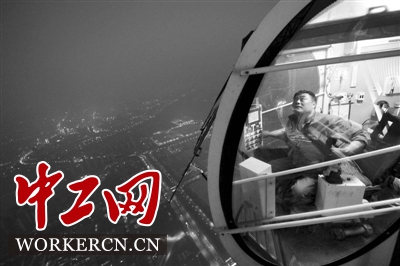 塔吊司机周瑜是117大厦12名塔吊司机之一,2012年国内最大的动臂式塔吊ZSL2700刚刚安装他就来了。大厦的钢板、钢筋、气瓶、钢构件都由塔吊司机来吊装,周瑜已经完成了近3万吊的吊装工作。