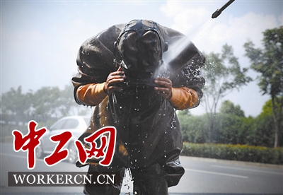 图为9月6日,倪师傅完成井下任务,在同事们的帮助下安全出井。之后,同事帮他冲洗掉身上的污泥。 (赖睿宁)