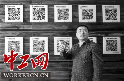 图为王晨阳在长春青年电商集聚示范园区内向记者介绍创业电商二维码宣传墙。 (新华社记者 王昊飞 摄)