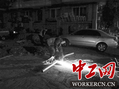 来自河北沧州的他,下个月就要过自己64岁的生日了。已经干了5个多小时活的他决定歇口气。和他一道的老乡们正在从路边的大卡车里扛10CM口径的钢管,停放一旁的切割机不时响起,火星四溅,把满脸的沟壑映得分外清晰。声音嘈杂,史忠亮几乎是靠比划跟《工人日报》记者交谈。就这样,史忠亮一边干活一边和记者交谈,直到早晨6点才勉强歇了会儿。
