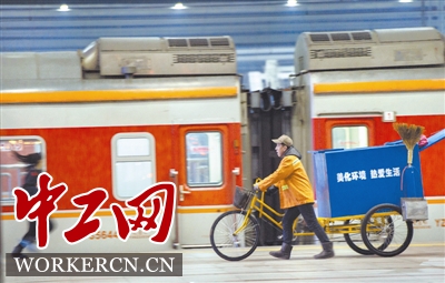 ①北京西站,环卫工人一早就赶到站台清理垃圾。 中工网记者 吴凡 摄
