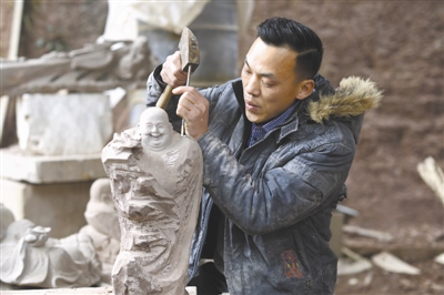 姜晓进在静心雕琢大肚弥勒佛像 。