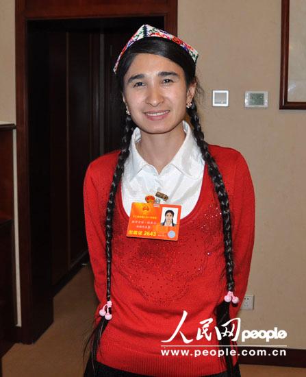 全国人大代表、浙江慈溪市宁波双源纺织发展有限公司新疆部员工负责人热汗古丽·依米尔 人民网记者 赵晶 摄