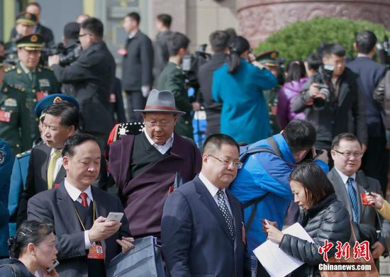 3月5日,十二届全国人大四次会议开幕会结束后,朱良玉离开人民大会堂。 中新社记者 刘关关 摄