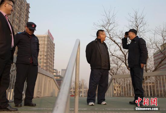 3月2日,朱良玉在北京一座天桥上与正在执勤的保安交流。 中新社记者 刘关关 摄