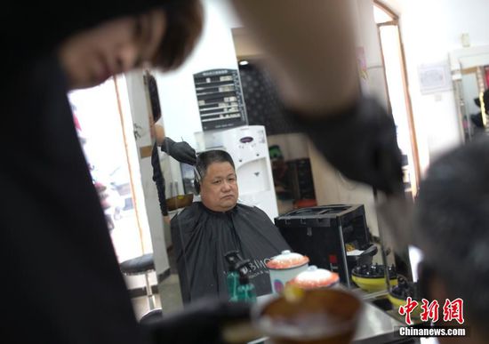 3月1日,朱良玉来到住处附近的一家理发店,修剪并染黑头发。 中新社记者 刘关关 摄