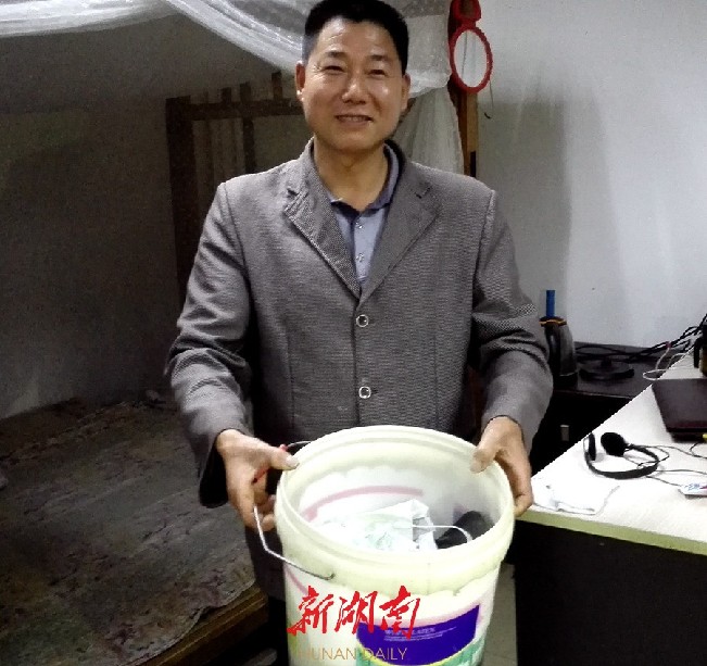 胡国辉向新湖南记者展示过年回家,在火车上用来当凳子的塑料桶