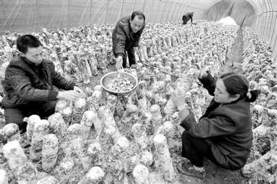 4月12,南江县红四乡永福村原在厦门务工的农民工陈啟国(左一)在兴办的食用菌种植基地与雇请的民工一道采摘香菇。他春节后,回乡投资20多万元,建起了年产10万公斤以上的椴木食用菌种植场,眼下每天都有三四千元的收入,并招收了10多个贫困农民进场务工。据了解,红四乡今年已有30多位农民工选择了返乡发展特色种养业。 肖定怀 摄