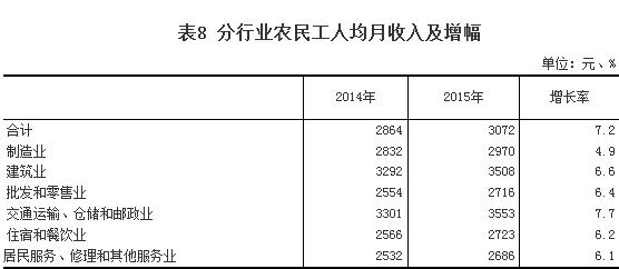 农民工人均月收入3072元,比上年增加208元,增长7.2%,增速比上年回落2.6个百分点。其中,制造业,建筑业,住宿和餐饮业,居民服务、修理和其他服务业农民工月均收入增速分别比上年回落6.7、4.4、2.2和4.1个百分点。