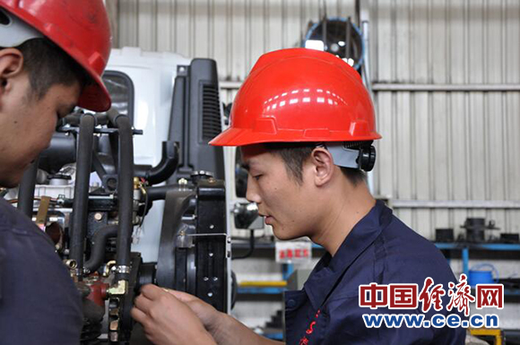 胡振球(右)在和工友车间工作 中国经济网记者马常艳摄