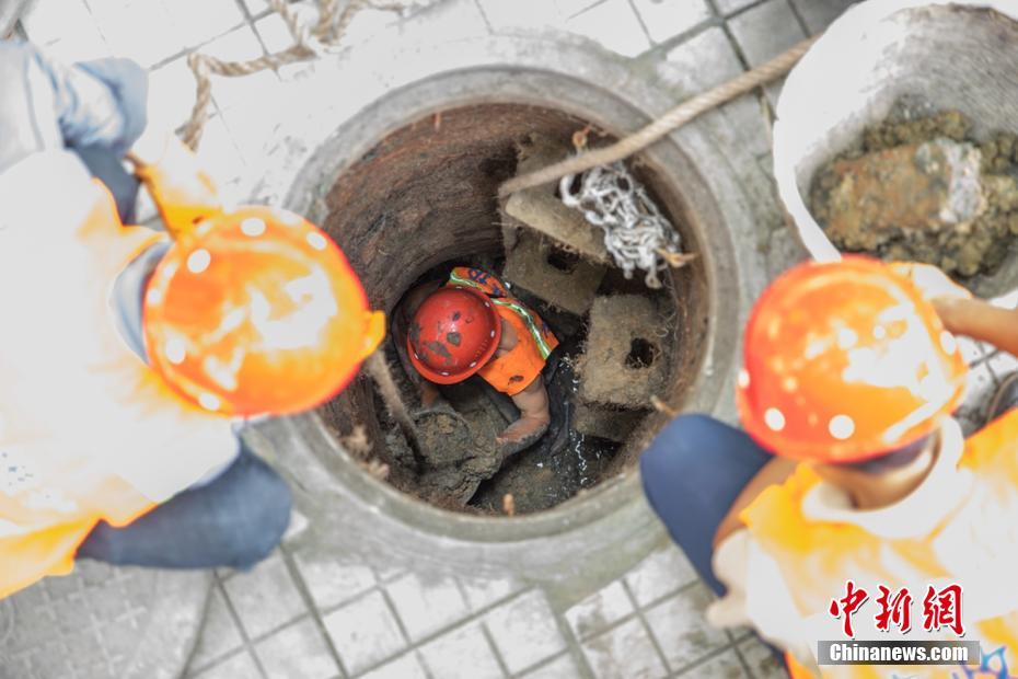连日来,在四川省眉山市东坡区,掏淤工人熊进诚和同事们忙碌着手工掏淤工作,守护着城市的“地下血脉”。据悉,在近40度的高温下,掏淤工人们依然需要进入充满呛鼻味的井下,用手将淤泥掏出。他们希望在雨季来临之前,和机械化疏通车一起将下水道疏通干净,为城市防汛打下坚实基础。文/刘刚 图/古良驹