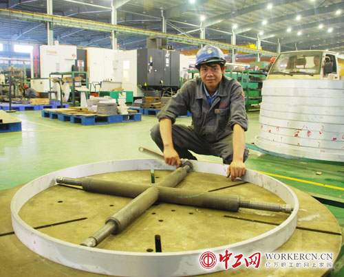 革新能手杨福龙在安装他革新的工装夹具。(傅乔成 摄)