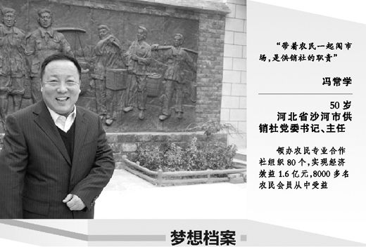 截至目前,沙河市供销社在该市11个乡镇发展和领办农民专业合作社组织80个,实现经济效益1.6亿元,8000多名农民会员从中受益,一跃成为河北省供销系统的“明星”社。社里的人说,这可多亏了冯常学,是他让沙河市供销史上“八条扁担闹太行”的那股劲儿又回来了!