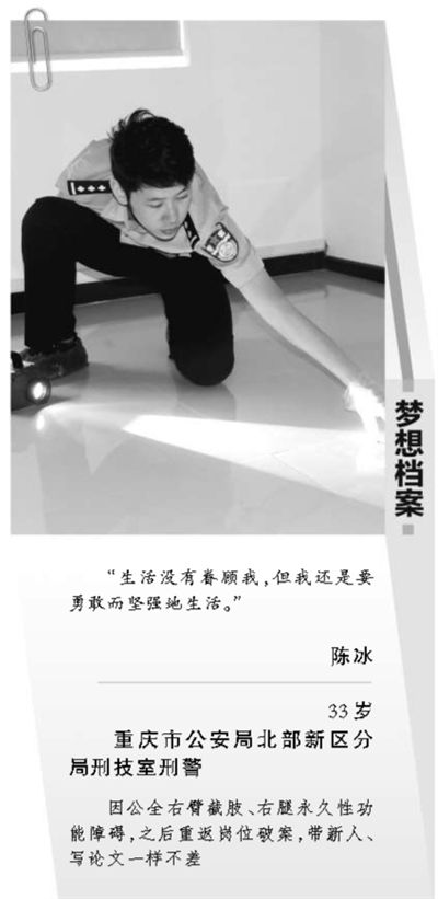 今年33岁的陈冰阳光、帅气,是重庆市公安局北部新区分局刑技室刑警。2004年陈冰从中国刑事警察学院毕业后,就从事刑事技术工作。4年前,陈冰在处置一起变压器电房盗窃案时,因电工疏忽不幸被1万伏高压电击中,整条右臂截肢,右腿永久性功能障碍,经鉴定为三级伤残。医生曾推断,他会以病床和轮椅为伴。