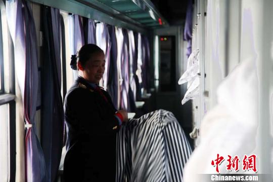 列车抵达终点站乌鲁木齐战后,寿春梅最后一次整理列车卧具。 张永恒 摄