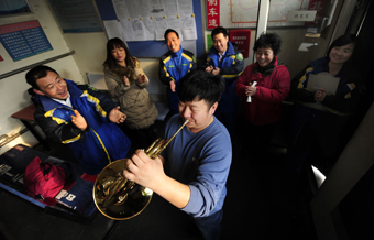 “怎么样,给我们吹一段儿啊!”公交特9路车队内,休息的同事跟车队团支部书记汪振开着玩笑。汪振腼腆一笑,拿起圆号来了段《天空之城》。