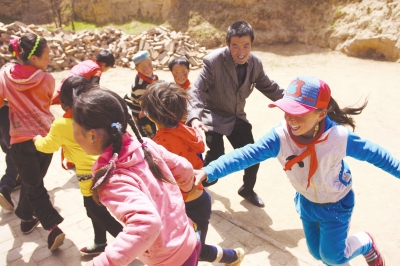 学校里几乎没有任何文体设施,李永年老师在课间休息时带着孩子们做游戏。