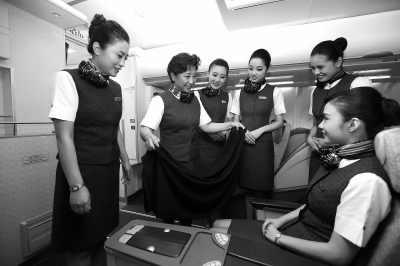 7月24日,在中国国际航空公司的模拟训练舱内,“金凤”乘务组的资深乘务员在培训新学员。本报记者 饶强摄