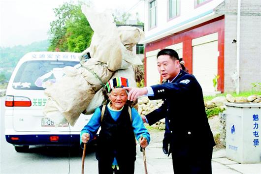 图为:向忠贻生前执勤时为农村老大娘指路。