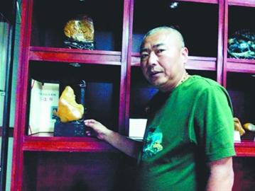 有一年,他家里装修完房子,想买一个雕件来作为摆设。在一家古玩店里看中了一个黄蜡石雕件。“当时它在我眼中真是太漂亮了,我的心一下子就被这块黄色的石头征服了!”也正是这一块石头彻底击中了埋藏在宋良心底多年的爱石之心,他由此从一个业余的石头爱好者华丽转身,全身心地投入到收集各种石头的疯狂中,特别是对黄蜡石尤其痴迷。 “现在我从宽甸、凤城等各地收集来的黄蜡石达几百吨。 ”他指着一块黄蜡石对记者说,“就是为了捡这块石头,我陷进了沼泽地里,险些丢了性命。 ”这块石头的确不错,几乎达到了黄蜡石冰种的级别,堪称极品。 “这块小石头我也不会卖,因为这里面有故事,是我疯狂玩石头经历的一个见证。”这些有故事的石头在宋良的眼里就是镇店之宝。