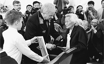 俄罗斯驻华大使安德烈·杰尼索夫为获奖者、抗联女战士李在德授予奖章。记者 韩 硕摄
