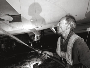 据了解,夏季飞机都在室外清洗;冬天因为温度太低,水洗会结冰,清洗工作要转移到机库内完成,有时只能采用打蜡的方式进行清洁。王红卫介绍,飞机上最脏的地方不是机翼和飞机上部,而是飞机的腹部。机腹附近集中了很多油液管路和排水口,灰尘、污水粘在这里后,最容易形成气流痕和锈迹。这种顽固污渍是最令清洗工人们头疼的,往往需要先用清洗剂进行浸泡,然后才能擦除。
