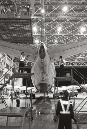 5月10日22时30分,飞机维修基地生产支援车间飞机清洗班组来到31号机坪,准备清洁B-1950号飞机。工人们先用水管冲洗飞机外表,然后用一根前端装有浸过清洗液海绵的铝合金伸缩杆来回擦拭。这种铝合金杆短的有2米长,最长的能达到5米。