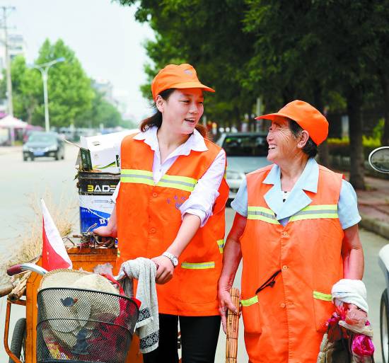 7月28日,大学生陈蒙恩和养母一起去清扫马路。暑假开始以来,在天津医科大学就读的陈蒙恩回到家乡山东沂南县,每天和当环卫工的养母陈荣一起扫马路。